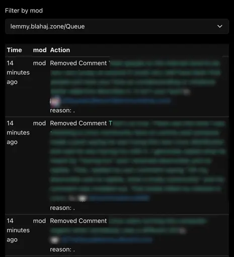This is a callout post y’all. Do better. Start putting actual moderation reasons into the modlog for the benefit of you and other mods, otherwise what is the point of a transparent and federated platform?
