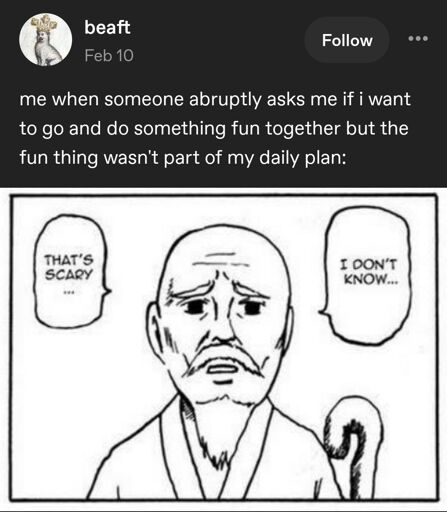 minus-squareapprehensively_human@lemmy.calinkfedilinkEnglisharrow-up12·22 hours agoThis seems more like an introvert thing. If I’ve already exhausted my social battery for the day, ain’t no way I’m agreeing to interact with more people later.