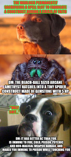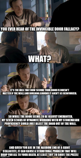 6·4 months agoSo the door itself had a sorta embossing design of an incomplete web. You would have to complete the webbing but there is a trap part that, if connected, triggers active, offensive traps. With a good investigation roll, my arcana and a Web spell from the rogue’s cloak, we did the puzzle and the door opened itself