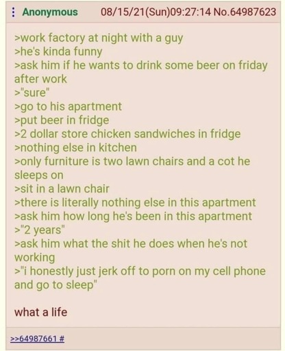 No, that sounds like a lot of effort and I have plenty. Greentexts have varying degrees of weirdness. Sometimes anon is an offensive degenerate, and sometimes he just wants to tell you about his work bathroom.