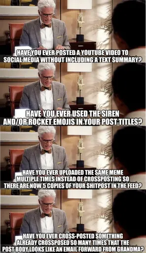 6·9 days agoI mean, it might if you did all 4 of those with the same post. lol. The Judge would invent “The Super Bad Place” for that.