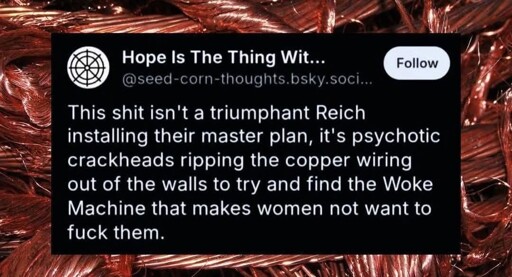 Lmao way to turn that on me, good one. I’m literally talking about the people who can’t just scroll past or block something without needing to act like it was forced on them. The people who campaign to cancel Netflix over 1 show out of 1000s that they could’ve just scrolled past. The people who live in an era where you can follow exactly what you want online, and watch and listen to exactly what you want on streaming, but still complain about having the wOkE aGeNdA shoved down their throats because they’re incapable of wiping their asses (or they think it’s gay).