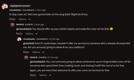 Idk if I’d call it mean spirited, but it sure was meant to be rude, yeah. Why should I respect someone who so blatantly disrespects me and my creative peers, and in such an obviously hypocritical way? I would never incite harassment against anyone, but I have no tolerance left for people who do anything less then shun this stuff. We’ve all had years to understand the harms “generative” AI causes, yet some people who run decentralized instances, heck, even those who create open source tools, continue to either turn a blind eye or be outright accepting of this shit.