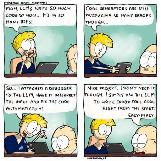 Would such a setup make sense? Not really. But you know, that’s why it’s a four-panel-comic and not some overrated ai startup. Or maybe it is, it seems like making sense isn’t really a requirement for tech startups anymore.